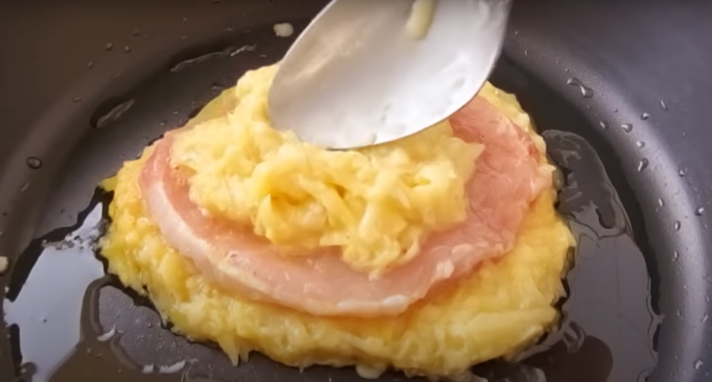 W osobnej misce umieść 2 jajka i roztrzep je widelcem. W tych jajkach będziesz zamaczać plastry mięsa. Podgrzej olej na patelni. Przyszedł czas na smażenie placków. Ułóż na patelni ziemniaki, następnie połóż plaster mięsa zamoczony w jajku i przykryj drugą warstwą ziemniaków.