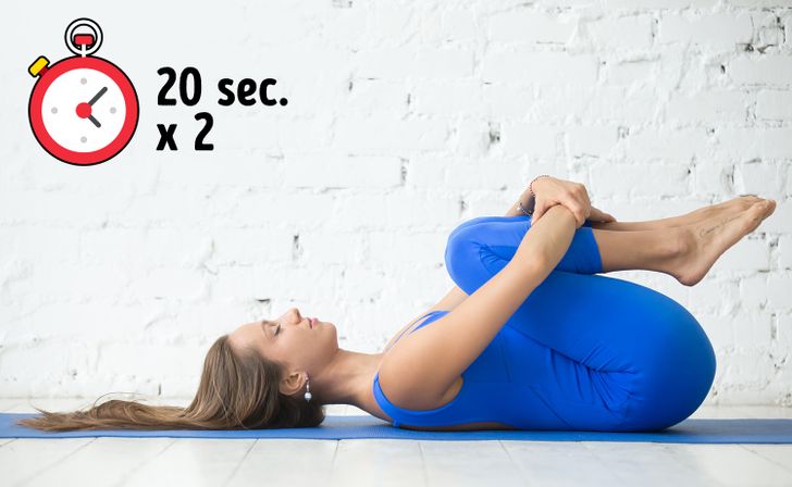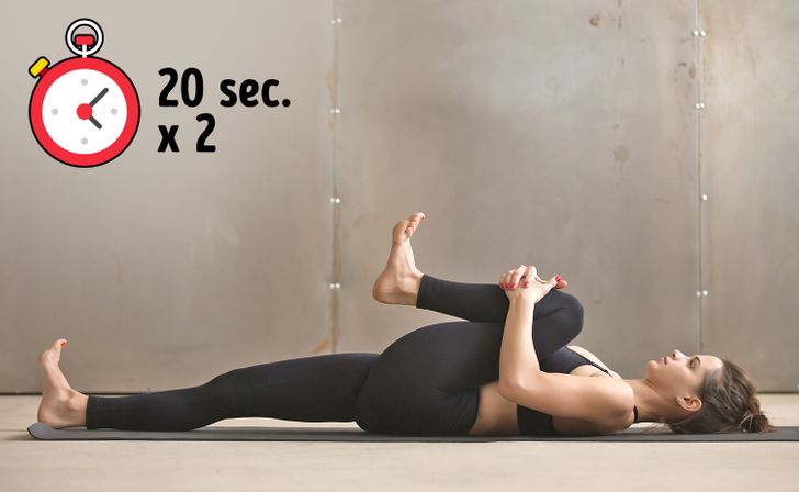 Połóż dłonie na brzuchu i zegnij kolana w bok. Następnie owiń ręce wokół kolan. Nogi powinny znajdować się jak najbliżej klatki piersiowej. Powtórz to ćwiczenie 2 razy po 20 sekund. Dzięki temu zwiększysz zakres ruchu dolnej części pleców i poprawisz przepływ krwi.