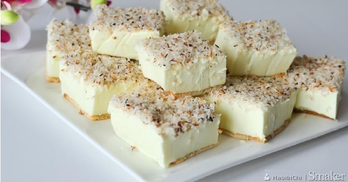 Śmietaną ubij na wysokich obrotach. Do miski dodaj cukier puder i cukier waniliowy.Wciąż miksując, lecz na mniejszych obrotach, po łyżeczce dodawaj twaróg. Na koniec dodaj galaretkę i delikatnie wymieszaj powstałą masę. Poczekaj, aż masa stężeje. Na dnie blaszki ułóż herbatniki Petit Beurre. Gotową masę wylej na wierzch, posyp wiórkami kokosowymi.