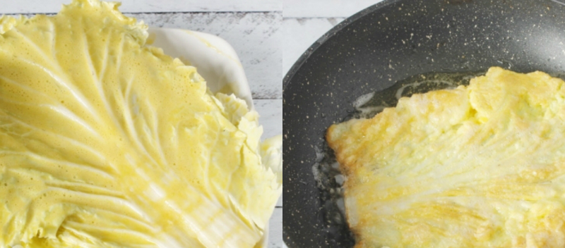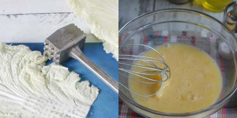Przygotowanie liści: Przygotowanie liści kapusty: należy oddzielić je od całości i usunąć część podstawy, która jest najtwardsza, a następnie rozbić liście za pomocą tłuczka kuchennego. Wymieszać jajka z solą i pieprzem w misce. Dodać mąkę i dokładnie wymieszać, by powstała masa była gładka i pozbawiona grudek.