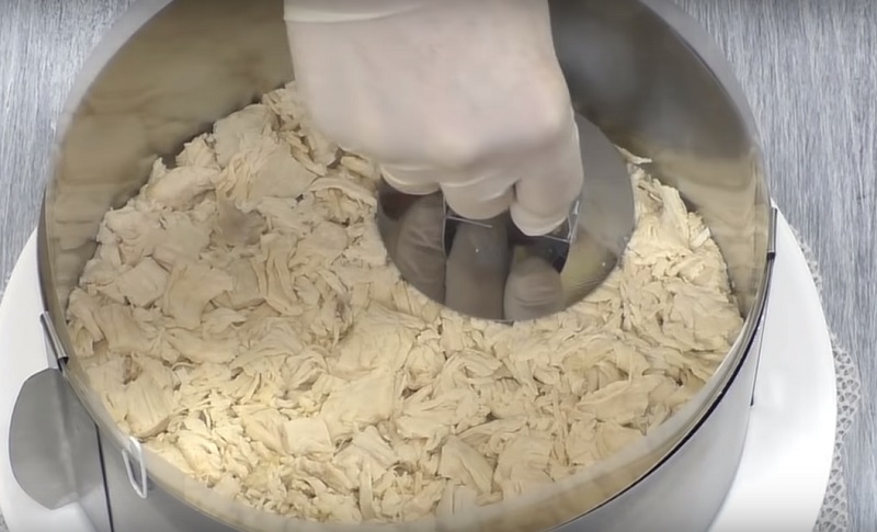 Przygotować miskę lub formę. Można użyć blachy do pieczenia ciast o średnicy ok. 20 cm. Wyłożyć kurczaka jako pierwszą warstwę sałatki. Równomiernie rozprowadzić i posmarować majonezem. Część ziół rozłożyć jako kolejną warstwę. Odcedzić płyn z zamarynowanej wcześniej cebuli, a cebulę ułożyć na ziołach.