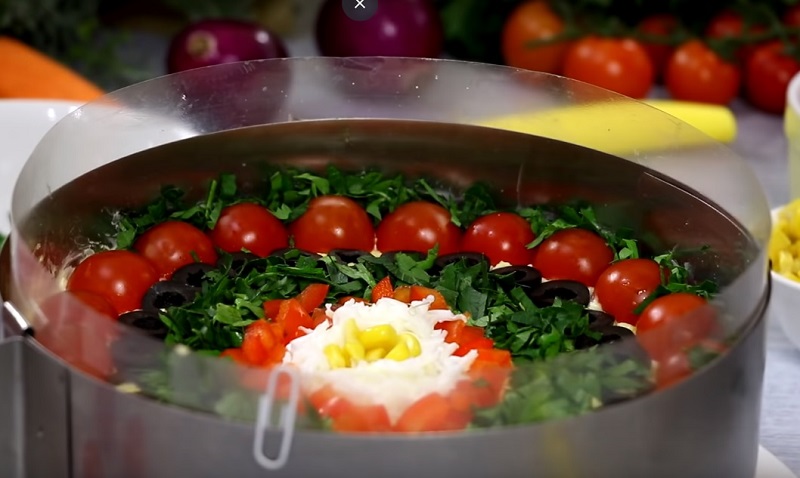 Z ziół przygotować kolejny okrąg wewnątrz. Pozostały środek wypełnić kukurydzą i pokrojoną drobno papryką. Tak przygotowaną i pięknie ozdobioną sałatkę owinąć folią i wstawić do lodówki na ok. 3 godziny albo całą noc.