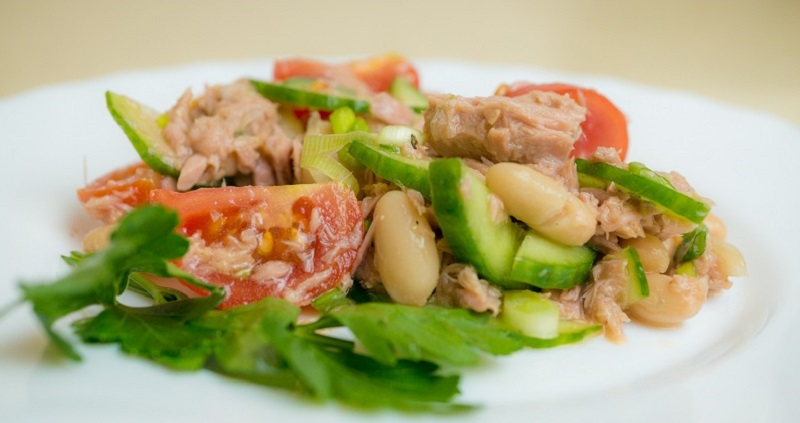 Warzywa umyj, pokrój w kostkę. Tuńczyka i fasolkę odcedź z zalewy. Rybę rozdrobnij widelcem w głębokiej misce, dodaj pozostałe składniki. Całość dopraw oliwa z oliwek, sokiem z cytryny i przyprawami.