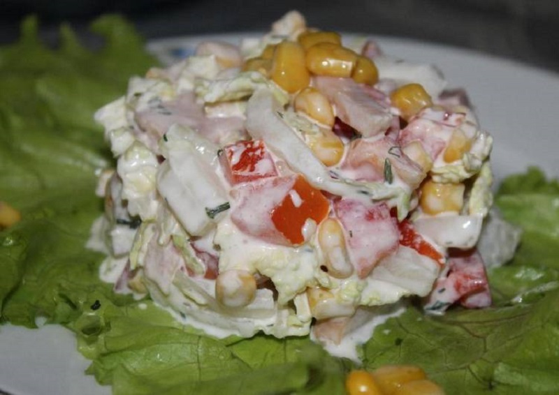 Pomidora i paprykę pokrój w kosteczkę. Ogórka zetrzyj na tarce o dużych oczkach. Mięso posól i ugotuj na parze. Pokrój w kostkę, gdy ostygnie. Posiekaj drobno koperek. Wszystko wymieszaj z jogurtem i kukurydzą. Dopraw tak, jak lubisz.