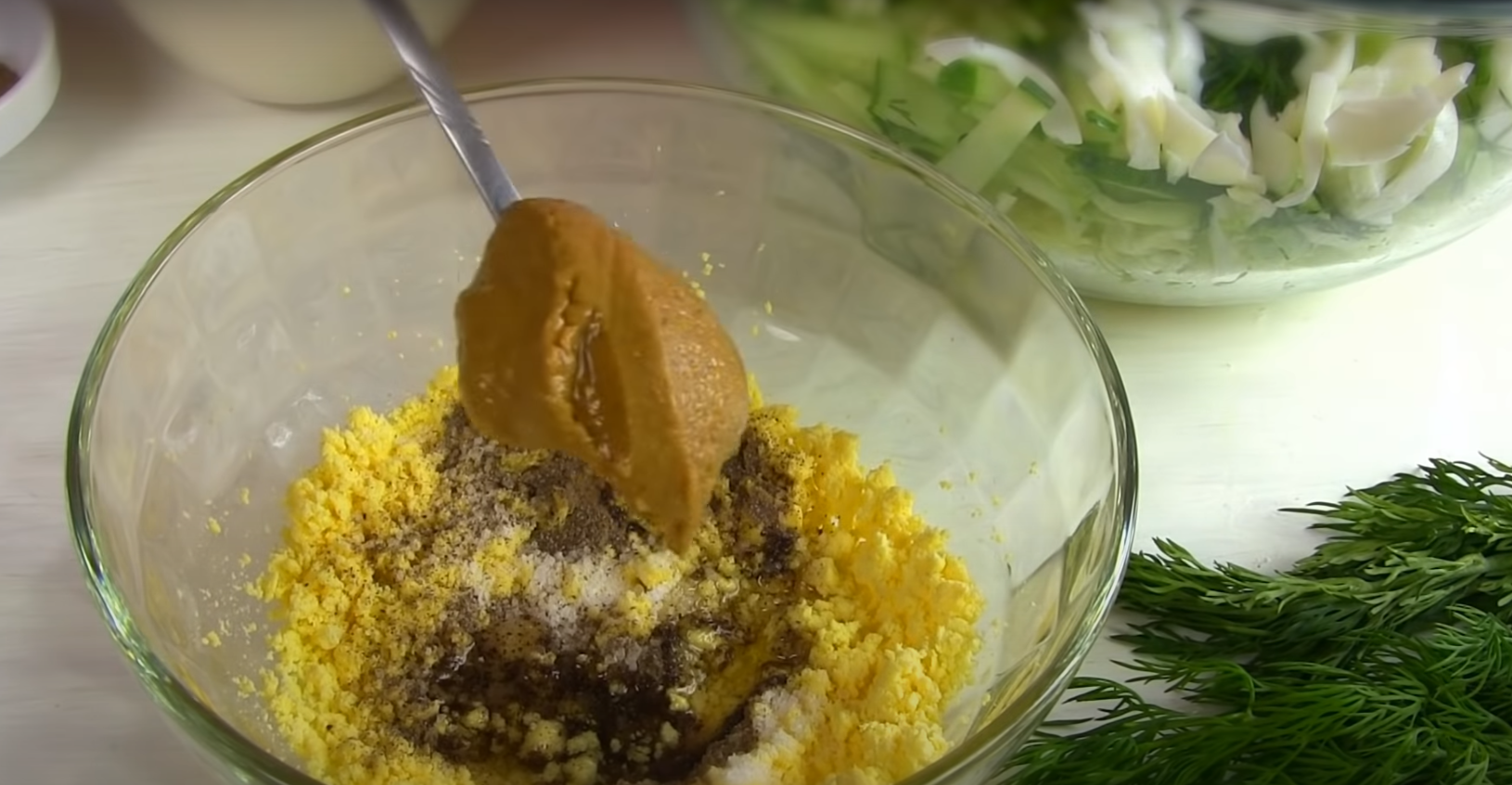 Jak poprzednim razem pamiętaj, by umyć składniki. Kapustę poszatkuj, ogórka pokrój w plasterki. Ugotuj jajka. Białka oraz żółtka oddziel od siebie. Białka jajek pokrój w kostkę, a żółtka rozgnieć za pomocą widelca. Koperek oraz kolendrę posiekaj drobno.