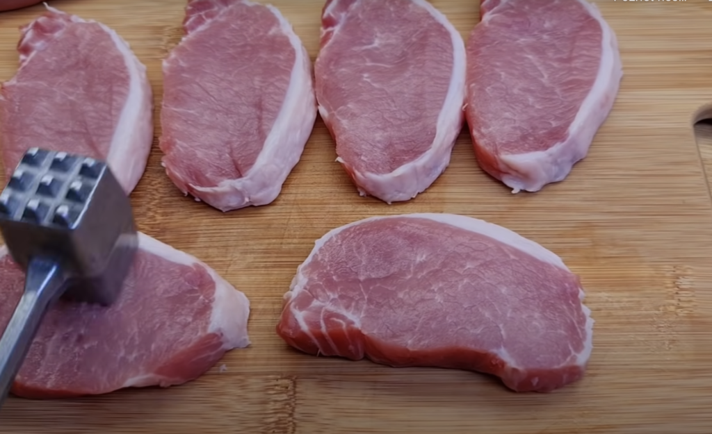 Jajka powinny być ugotowane na twardo. Mięso pokroić na kawałki o grubości 1 cala, a następnie delikatnie ubić tłuczkiem.