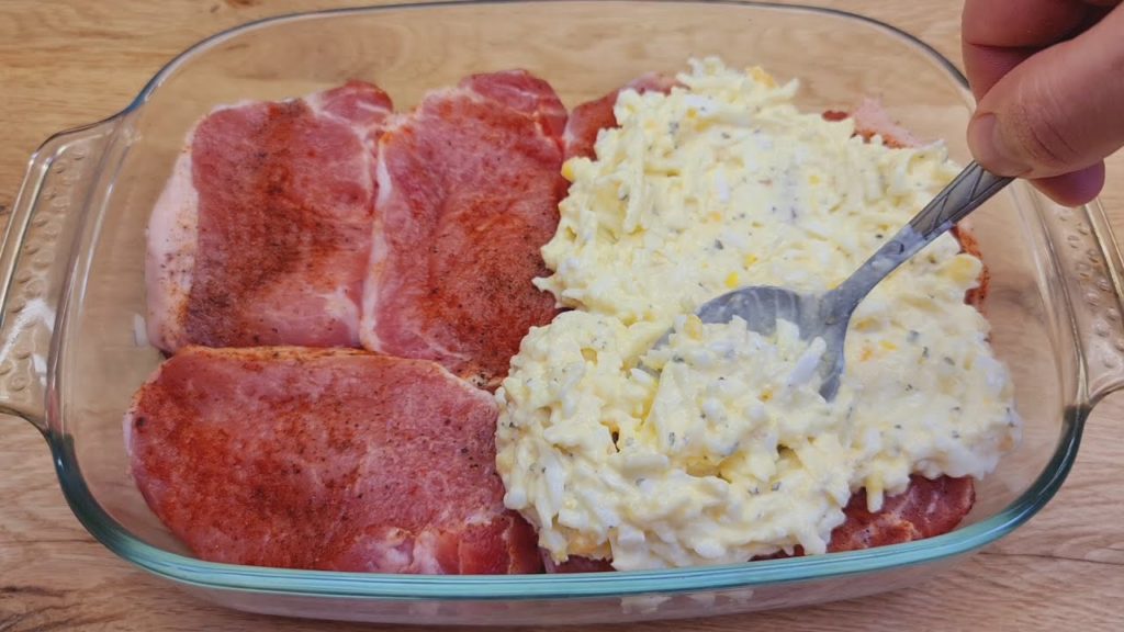 Rozłóż masę równomiernie na mięsie. Wygładzić masę i piec w temperaturze 180°C w nagrzanym piekarniku. Piec przez 40 minut.