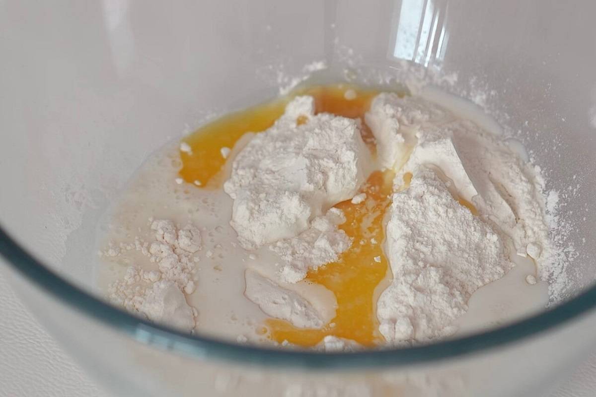 Przygotuj na początek ciasto, żeby to zrobić wymieszaj mąkę, mleko, sól do smaku, oraz roztopione masło.