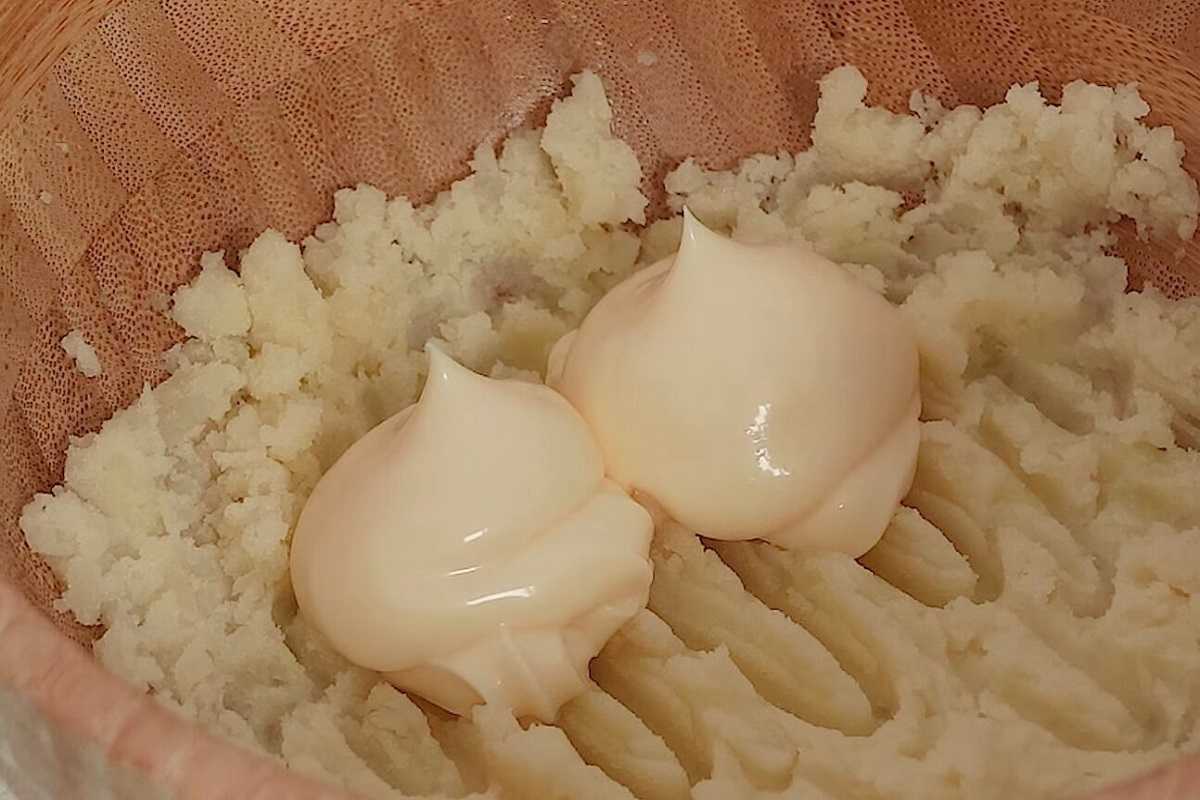 Później ugotuj do miękkości ziemniaki, po czym je zetrzyj. Dodaj majonez oraz wymieszaj.
