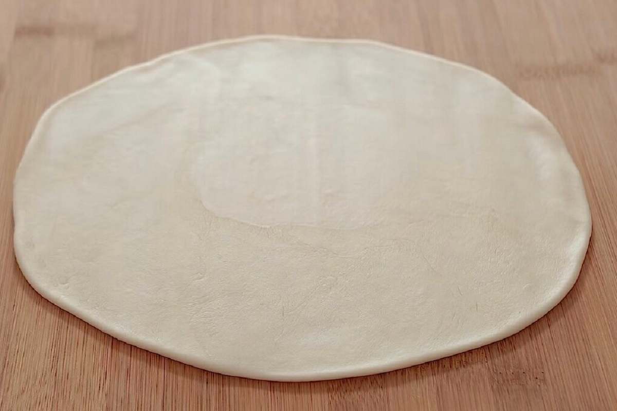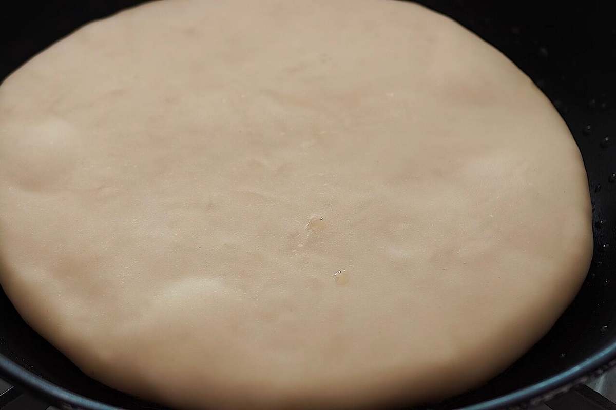 Połącz brzegi ciasta i je zamknij. Rozwałkuj lekko ciasto wałkiem przeznaczonym do ciasta, wyłóż ciasto na wysmarowaną tłuszczem patelnię i smaż na małym ogniu na złoty kolor z obu stron.