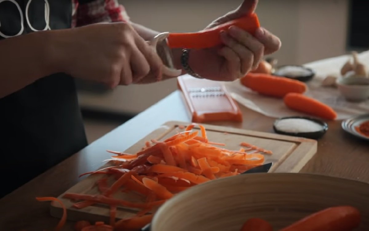 Do przygotowania marchewki po koreańsku będziesz potrzebować specjalnej tarki, tak zwanej tarki do koreańskiej marchewki lub niszczarki.