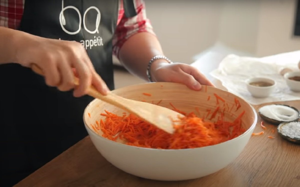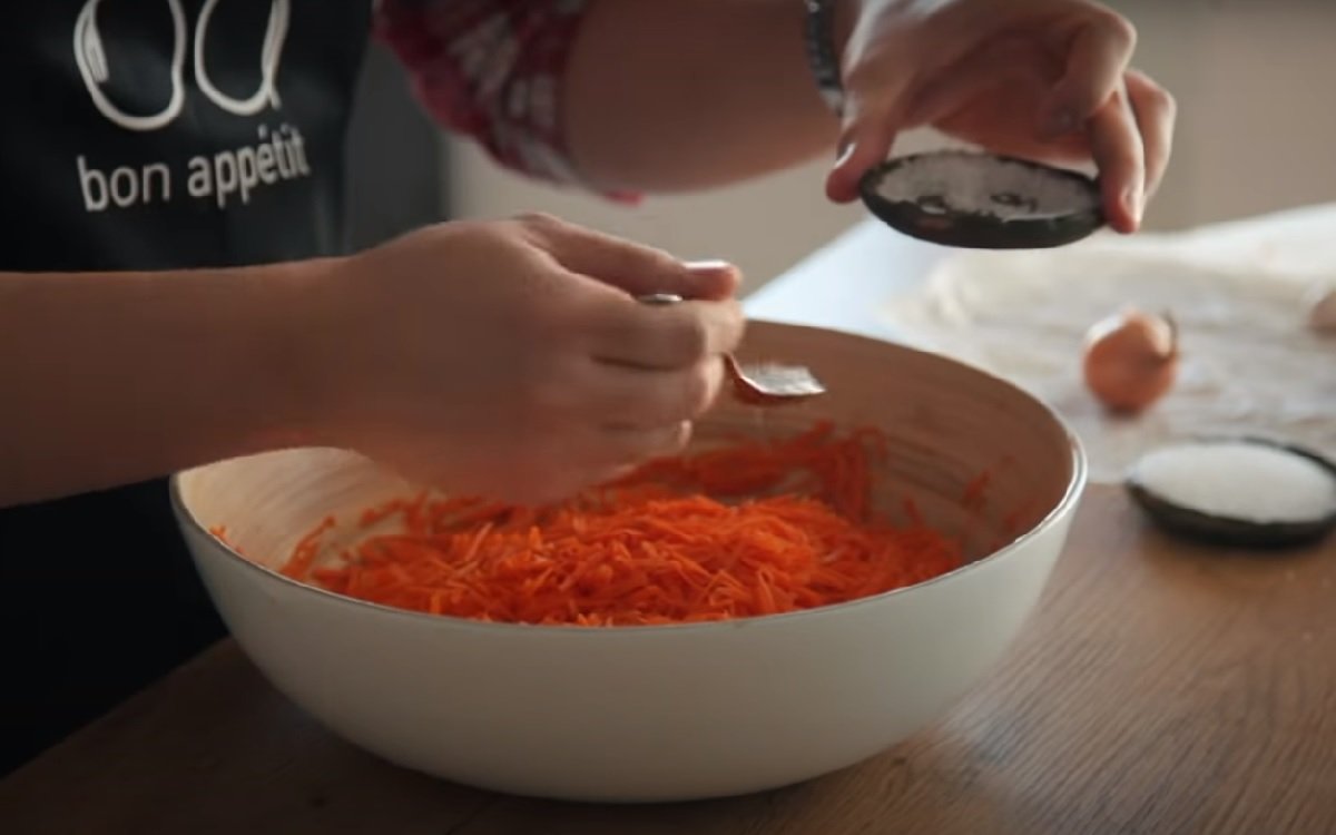 Marchew obierz i zetrzyj na wyżej wymienionej tarce. Następnie włóż do dużej miski. Dopraw solą i cukrem i dokładnie wymieszaj (na kilogram marchewki przypada pół łyżeczki cukru i łyżeczka soli).