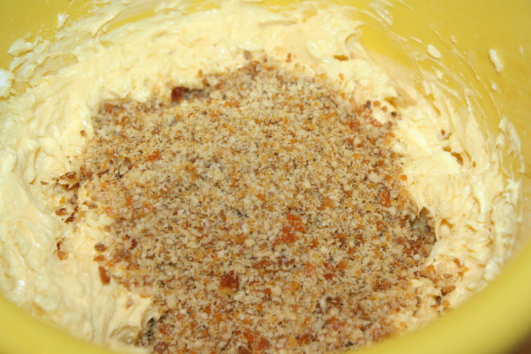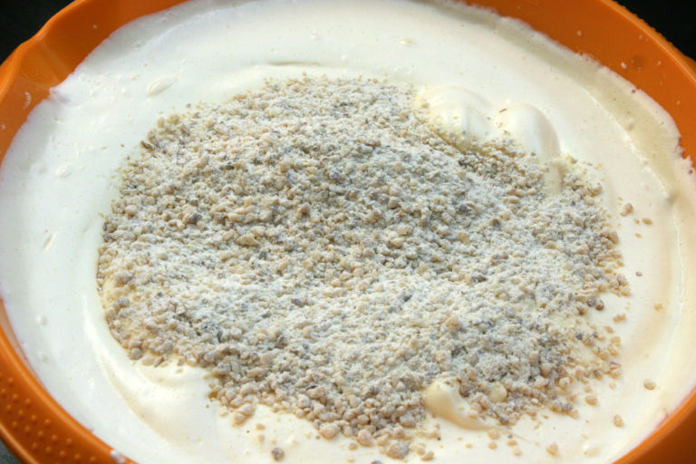 Pod koniec, do powstałej masy, wsypujemy mąkę pszenną połączoną z orzechami.