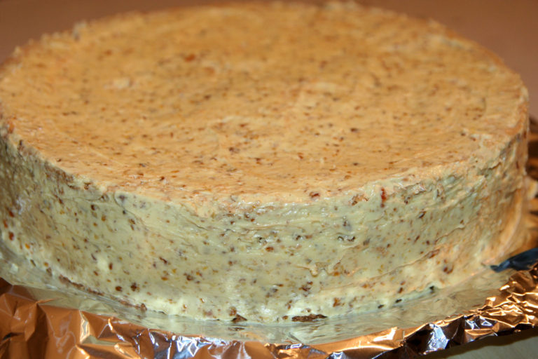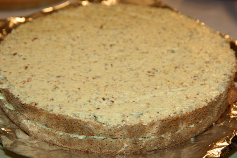 Kolejne warstwy traktujemy tak samo. Góra i boki ciasta również smarujemy kremem i posypujemy orzechami włoskimi z każdej ze stron.