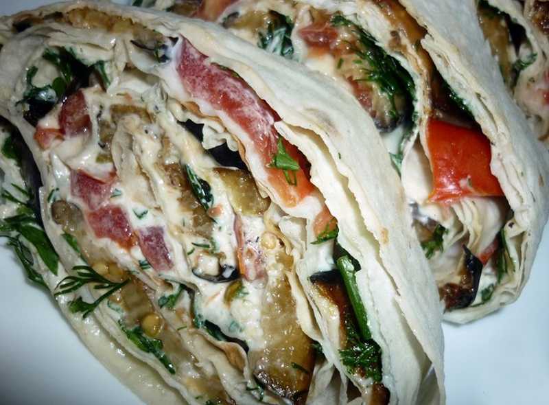 Wymieszaj 20 dag twarogu z 2 łyżkami śmietany oraz koperkiem. Dodaj do masy przeciśnięte 2 ząbki czosnku i odrobinę soli do smaku. Posmaruj tortille i zwiń ciasno.