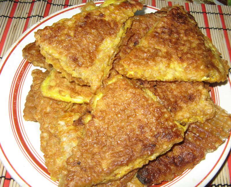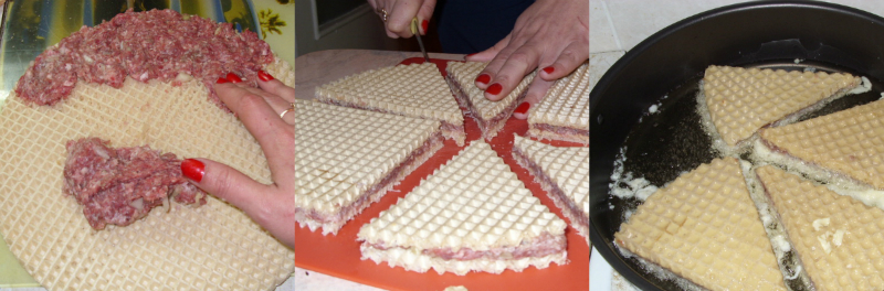 Z resztą ciastek waflowych i mięsnej masy robimy tak samo. Teraz do miski wlewamy mleko i dodajemy 2 jajka, dokładnie wszystko mieszamy. Do tak przygotowanej masy jajecznej wkładamy każdy z kawałków wafli z mięsem, obtaczamy go z każdej strony, a następnie smażymy na patelni.