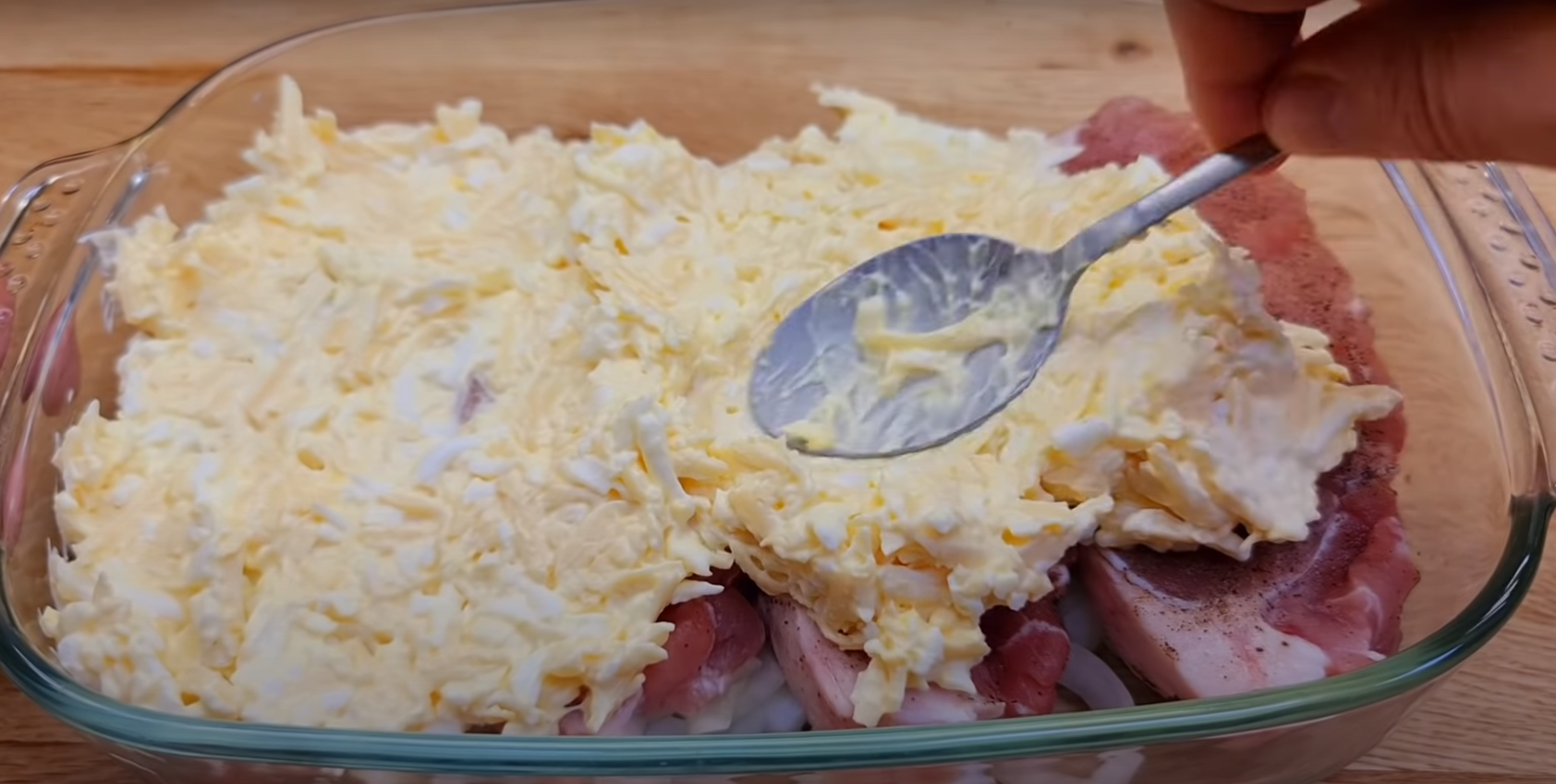 Do osobnej miski wrzuć starty żółty ser oraz starte jajka, dodaj majonez, sól i przyprawy i wszystko dobrze wymieszaj. Przygotowaną w ten sposób pastę do smarowania rozprowadź grubą warstwą na plastrach schabu ułożonych w naczyniu żaroodpornym.