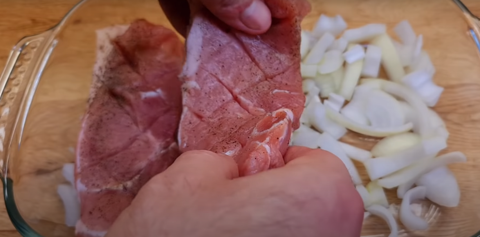 W pierwszej kolejności ponacinaj plastry schabu nożem po przekątnej, tak żeby powstał na nich wzór kratki. Następnie posyp schab solą i pieprzem z obu stron. Przygotuj naczynie żaroodporne. Posiekaj cebulę w piórka i ułóż ją na dnie naczynia. Na cebuli ułóż przygotowane wcześniej plastry schabu.